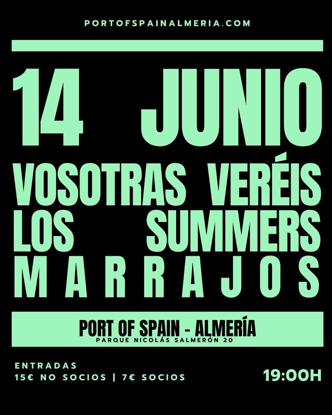 Hemos pensado que para qué esperar más, que en una semana hay muchas horas de playa y que arrancamos la temporada de verano 7 días antes, el 14 de Junio y frente al mar, para que las chulapas Vosotras Veréis abran la temporada estival de conciertos en Almería (que allí en Madrid no hay playa, como rezaba la canción) junto a las dos bandas que más representan el verano en nuestros dominios: Los Summers & Marrajos.